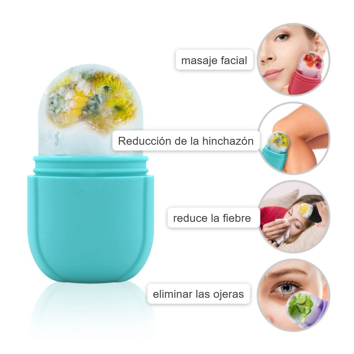 Solo llena el molde con agua, congela por 4 horas y aplica sobre tu piel con movimientos circulares cada 30 segundos. Refrescante, natural y práctico. 💆♀️🌀